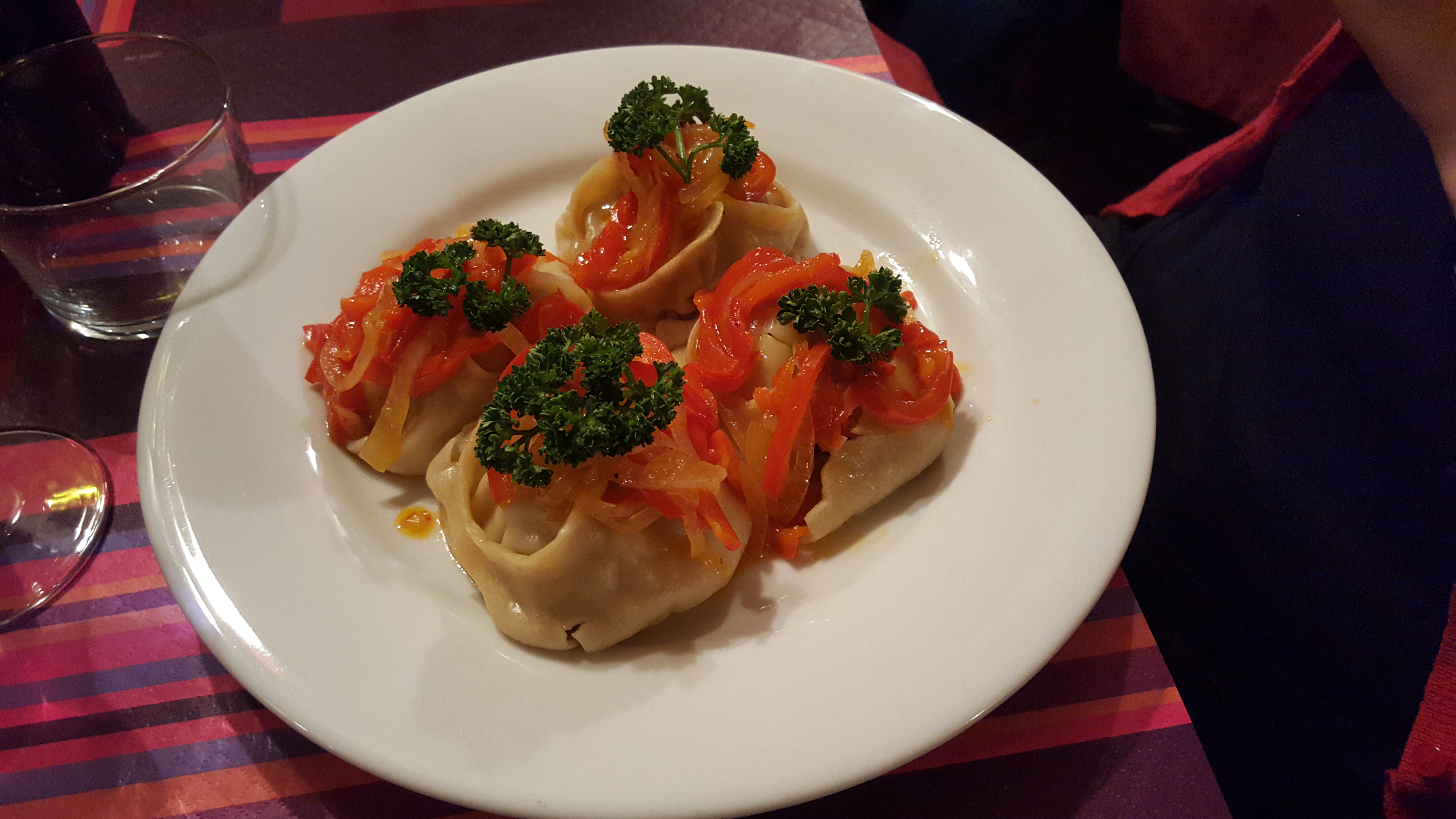 Une vraie immersion en Asie centrale. J’ai pu manger les ravioli Mantis dont je rêvais, un vrai délice. La cuisine est parfaite et le patron adorable. On reviendra !