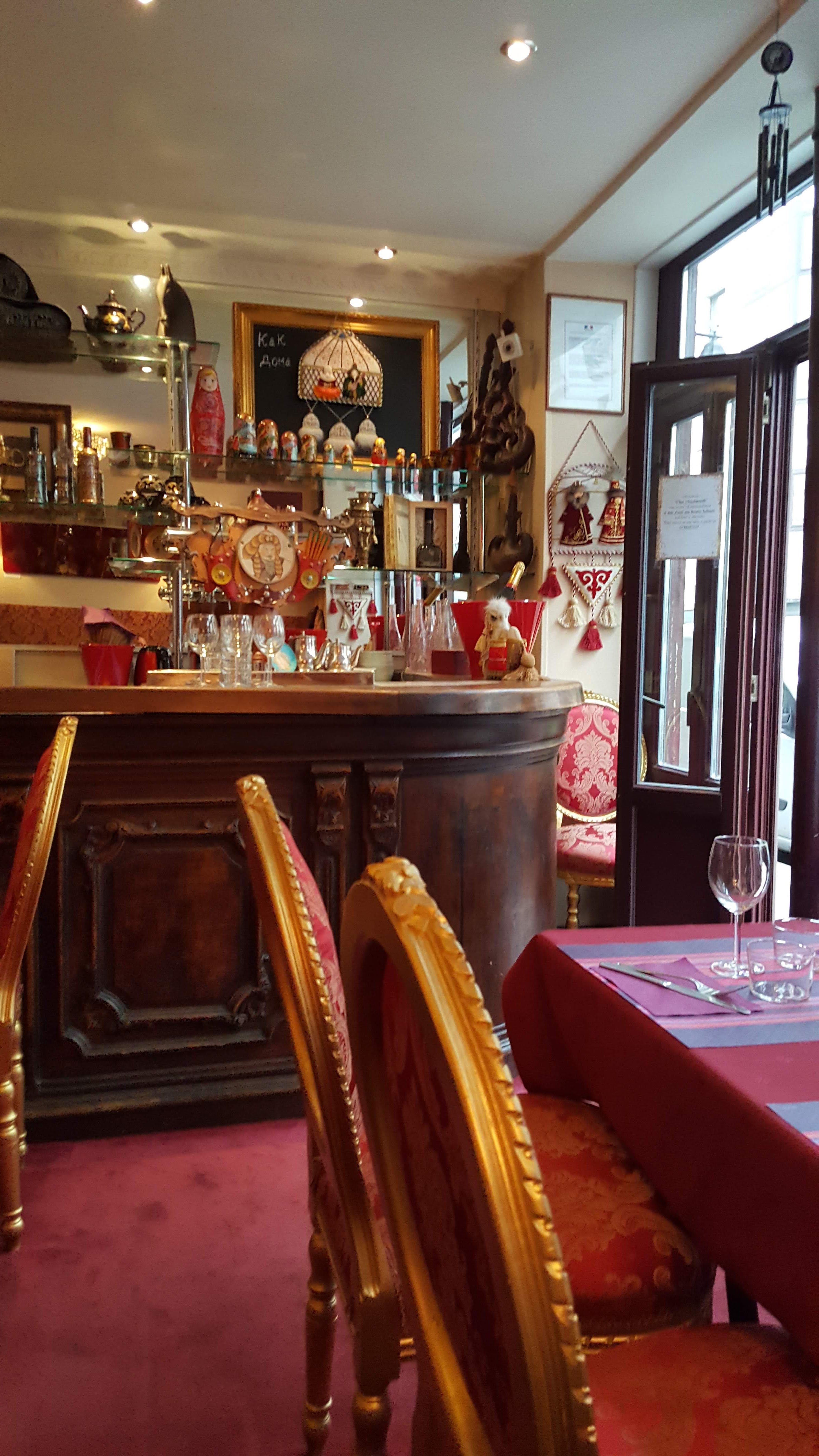Pour une escapade russe en plein cœur de Paris. Nous étions curieux de découvrir une gastronomie trop peu connue en France. Ce restaurant présentait toutes les caractéristiques pour une bonne expérience : Une cuisine très éloignée de nos spécialités françaises, l'accueil très chaleureux, la décoration très typique des salles à manger impériales avec ses chaises anciennes et ses tons rouge et or ou encore le délicieux accent de notre hôte. Nous avons été orientés selon nos goûts par cette femme adorable et en partageant nos plats nous avons eu l'occasion d'en découvrir encore plus. D'un point de vue culinaire, un vrai plaisir également. De la langue de belle mère au manteau de fourrure en entrée, des mantias à l'incontournable bœuf stroganoff en plat en finissant par un Napoléon et une création originale au dessert, nous avons eu l'impression de voyager le temps de quelques bouchées arrosées de vodka et de bières russes. Même les cornichons apperitifs valent le détour! Enfin, il est possible de manger à deux pour un prix certes un peu plus élevé que la moyenne mais ô combien justifié et suffisamment raisonnable. Une très belle expérience d'ensemble pour qui veut découvrir cette gastronomie d'un des plus grands pays du monde. Très fortement recommandé.